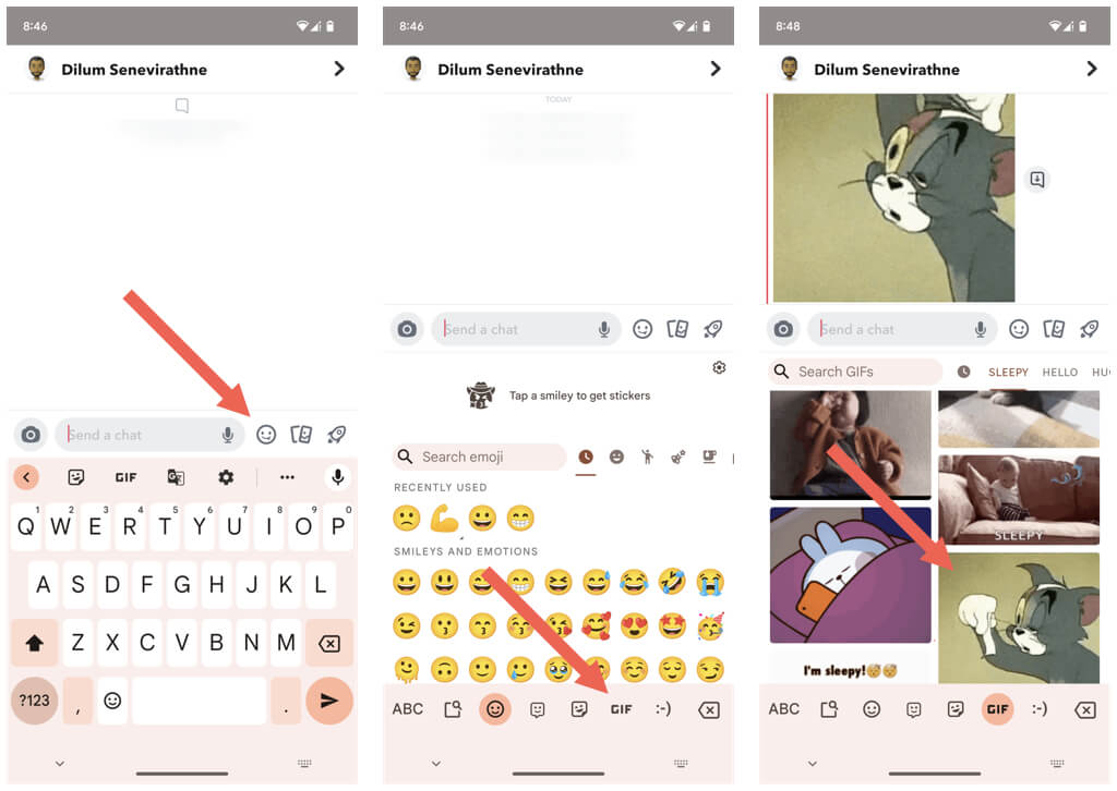 Telefonunuzun kamera rulosunda veya fotoğraf kütüphanesinde herhangi bir GIF varsa, bunları kopyala ve yapıştırma ile Snapchat konuşmalarınıza ekleyebilirsiniz.