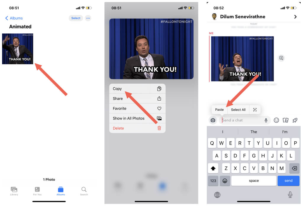 - Telefonunuzun kamera rulosundan veya fotoğraf kütüphanesinden uzun bir GIF basın ve dokununKopya.