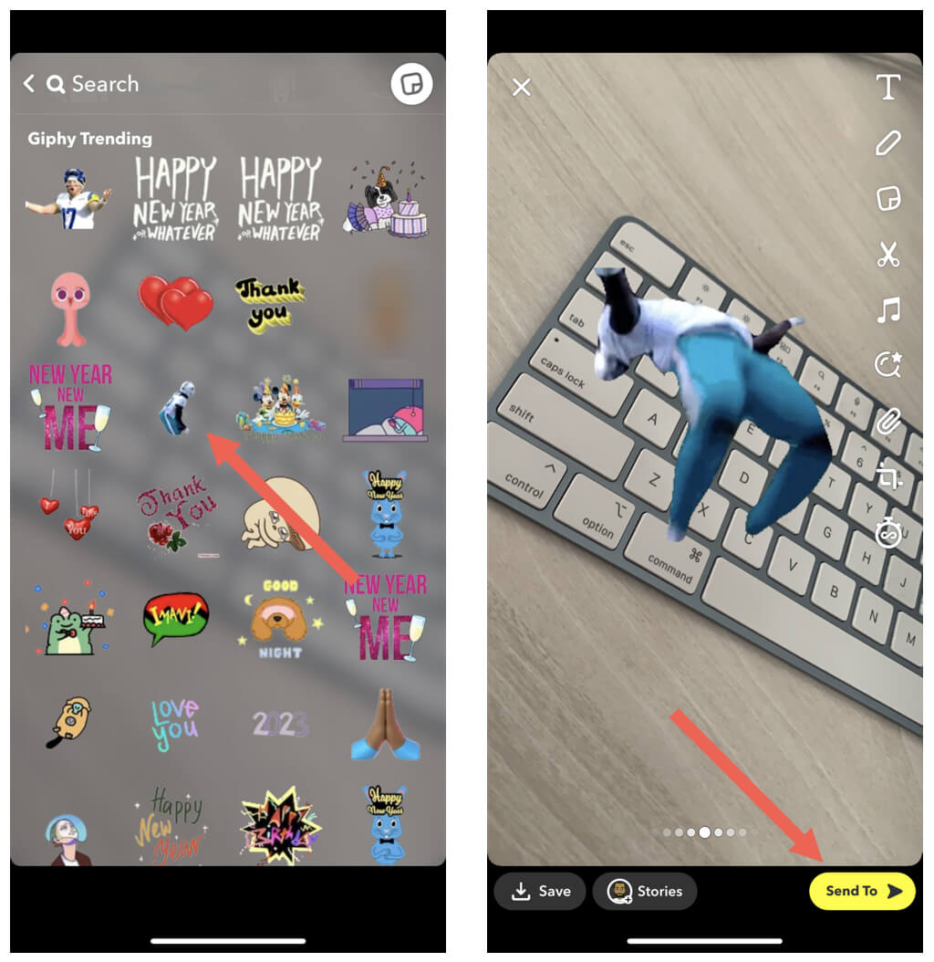 Snapchat, Snapchat hikayelerinize kolayca animasyonlu çıkartmalar eklemenizi sağlayan entegre bir GIF kütüphanesine sahiptir. Görüntüleri getirirGipaki, internetteki en büyük GIF ana bilgisayarlarından biri, bu yüzden aralarından seçim yapabileceğiniz bol miktarda malzeme var.