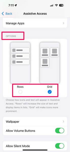 8.Bir sonraki ekranda,Destekli Erişim Ana Ekranının Düzenini Seçin. Mevcut iki seçenek var -SatırVeIzgara. Satırlar tüm etkin uygulamaları daha büyük metinlerle listeleyecek olsa da, Grid daha büyük uygulama simgeleri ve daha küçük metinler gösterecektir.