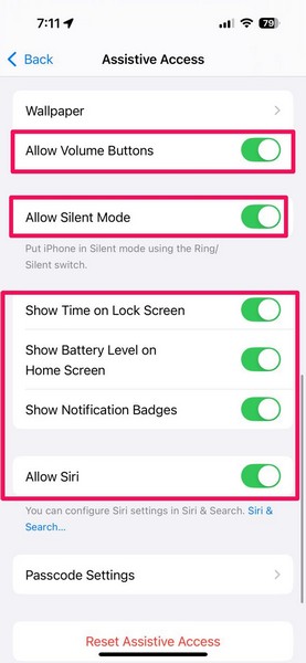 8.Buradan etkinleştirebileceğiniz veya devre dışı bırakabileceğiniz diğer kendi kendini tanımlayan yardımcı erişim ayarlarıHacim düğmelerine izin ver-Sessiz Moda İzin Ver-Kilit ekranında zaman göster-Ana ekranda pil seviyesini göster-Bildirim Rozetlerini Göster, VeSiri'ye izin ver.