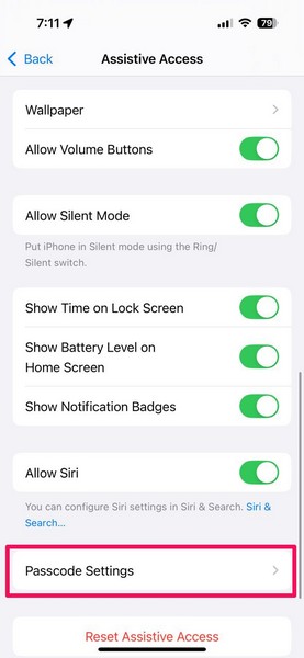 9.Ayrıca yapabilirsinizPostscod'u değiştirPasscode Ayarları sayfası aracılığıyla yardımcı erişimi etkinleştirmek ve devre dışı bırakmak için.