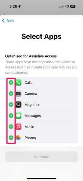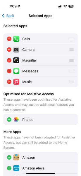 12.Yardımcı erişim için uygulamalar eklemek için,Yeşil + düğmesiHer birinin yanında veayarlarını ayrı ayrı özelleştirin.