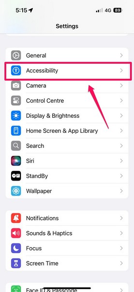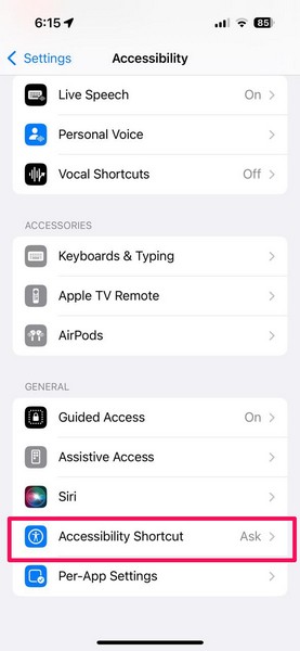 2.Bulmak için aşağı kaydırınErişilebilirlik kısayoluopsiyon veAçmak için dokunun.