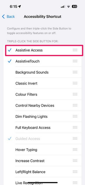 4.Şimdi basitçe yapabilirsinizYan/Güç Düğmesi Üçlü:(yüz kimliği özellikli iPhone modellerinde) veyaEv düğmesi(Dokunlu Kimlik özellikli iPhone modellerinde)Erişilebilirlik kısayol listesiVeYardımcı Erişim seçeneğine dokunun.