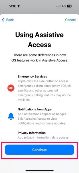 16.Bir sonraki sıçrama ekranında iOS, iPhone'da yardımcı erişim kullanırken belirli özelliklerin nasıl farklı çalıştığını size bildirecektir. Onları öğrenmek için bir kez gözden geçirin veDevam Düğmesidevam etmek.