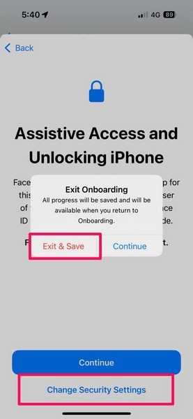 18.Alternatif olarak,Güvenlik Ayarları düğmesini değiştirCihazınızdaki Yüz Kimliği ve Parola Ayarlarını değiştirmek için. Bu iradeKurulum işleminden çıkın ve ilerlemeyi kaydedinİPhone'unuzda güvenlik değişikliklerini yapana kadar.