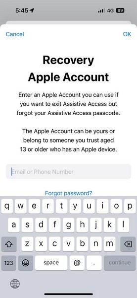 21.Bir sonraki ekranda,Bir kurtarma Apple hesabı ekleyin. Bu kurtarma hesabı, yeni ayarladığınız şifreyi/unuttuğunuzda/unuttuğunuzda iPhone'unuzda yardımcı erişimden çıkmak için kullanılabilir.
