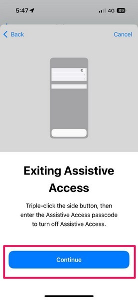 24.Bir sonraki sıçrama ekranıYardımcı erişimin nasıl çıkacağı hakkında bilgi verinİPhone'unuzda etkinleştirildiğinde. DokunDevam Düğmesidevam etmek.