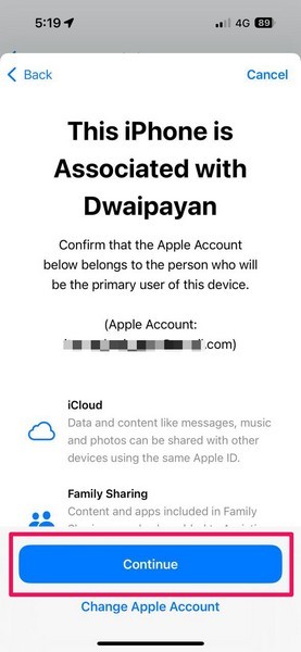 6.Aşağıdaki ekranda, cihazınız Apple Kimliğinizin ayrıntılarını sağlayacaktır. DokunabilirsinDevam DüğmesiKurulum işlemine devam etmek için.