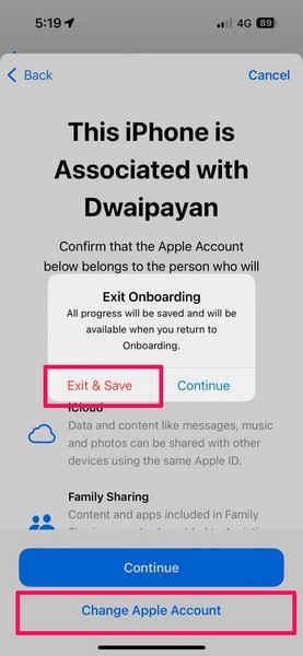 7.Ancak, Apple hesabınızı değiştirmek istiyorsanız,Apple hesabını değiştirdüğme. Bu, kurulum işleminden çıkacak ve yeni bir Apple hesabıyla oturum açana kadar ilerlemeyi kaydedecektir.