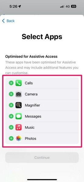 10.Şimdi, aşağıdaki ekranda,Uygulamaları etkinleştiriniPhone'unuzda yardımcı erişim kullanırken erişmek istediğiniz. Üstte, tüm uygulamaları (çoğunlukla sistem uygulamaları) bulacaksınız.Yardımcı erişim için optimize edilmiş.