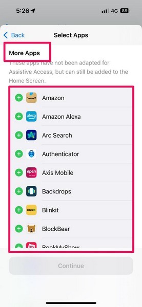 11.Sayfayı aşağı kaydırırsanız, listelenen diğer tüm uygulamalarınızı aşağıda göreceksiniz.Daha Fazla Uygulama Bölümü. Bu uygulamalar yardımcı erişim için optimize edilmemiş olsa da, bunları listeden yardımcı erişim ana ekranına ekleyebilirsiniz.