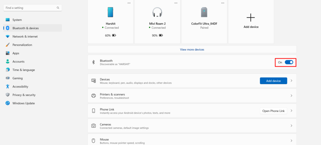 4.Şimdi göreceksingeçiş yapmakiçindeBluetooth ve diğer cihazlarAyarlar. Geçişe tıklayınBluetooth'u açın.Eğer açıksa geçişin yanında 'üzerinde' göreceksiniz.