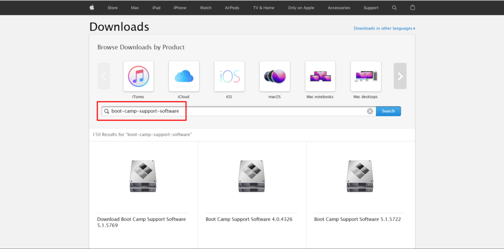 2.TipBoot Camp Destek Yazılımıarama çubuğunda ve tıklayınAramakdüğme.