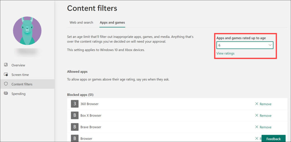 Microsoft ayrıca çocuğunuzun kullanmasına izin verilen uygulamaları ve oyunları kısıtlamanıza olanak tanır. Çocuğunuzun hesabı için belirli uygulamalara/oyunlara engelleyebilir veya izin verebilirsiniz.