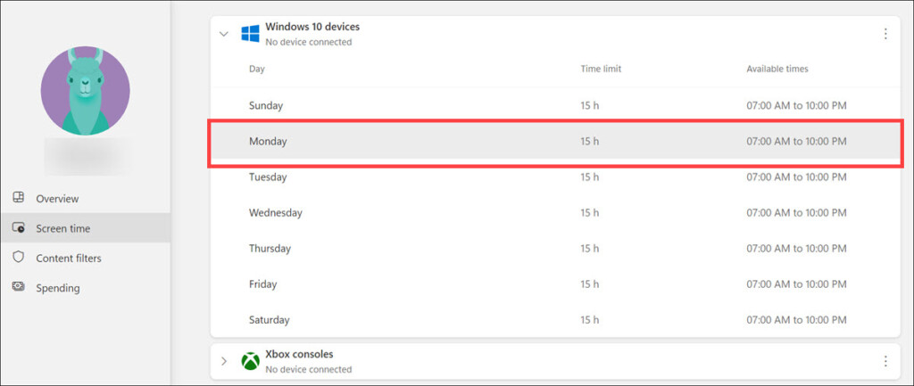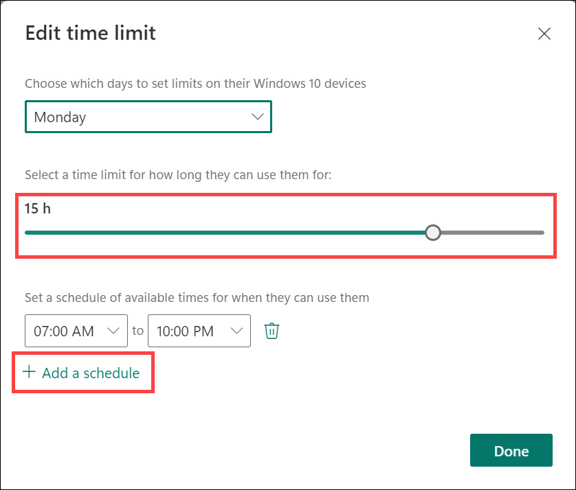 Microsoft, çocuğunuzun ekran süresi için günlük bir sınır oluşturmanızı sağlar. Cihazın kullanılmasına izin verildiği veya kısıtlandığı belirli zamanlar da ayarlayabilirsiniz. Örneğin, saat 21: 00-16: 00 arasında hiçbir cihaz kullanılmaması gereken bir kural oluşturabilirsiniz.