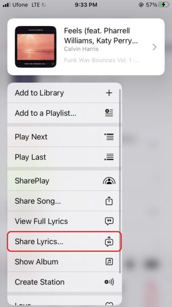 - Ardından, şarkıyı uzun süre basın ve dokununShare Lyrics.