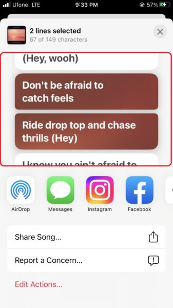 - Paylaşmak istediğiniz şarkı sözlerini seçin, 149 karakter sınırına uydukları sürece birden fazla satırı paylaşabilirsiniz.