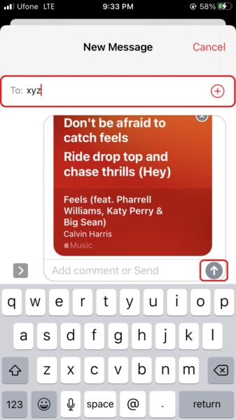 - Ardından, paylaşım sayfasındaki mesajlara dokunun> şarkı sözlerini göndermek istediğiniz kişiyi ekleyin ve Gönder'e basın.