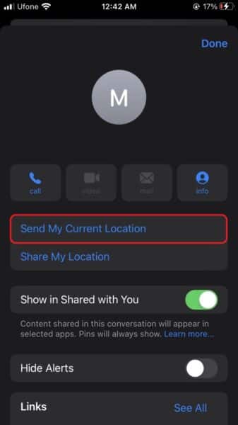 - Şimdi dokunabilirsinAkımımı gönderKonum. Bu, kişilerinizin konumunuzu haritada görmesine izin verecektir. Veya dokunabilirsinKonumumu paylaş, konumunuzu paylaşmak istediğiniz süreyi seçmenizi sağlayacaktır.