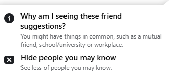 - Üç noktalı menüden tıklayın (veya mobil cihazdaysanız dokunun). Bu size iki seçenek getiriyor - sadece seçinTanıyabileceğin insanları saklaVe uygulama içi arkadaş önerileri bir süre kaybolacak.