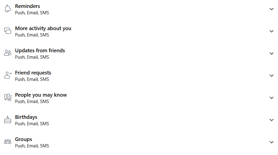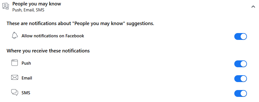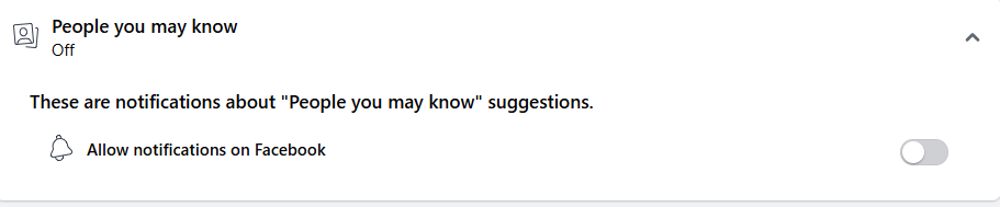 - Şimdi listelenen tüm bildirim kategorileri ile başka bir liste göreceksiniz. Biraz aşağı iner,Tanıyor Olabileceğiniz İnsanlarkategori.