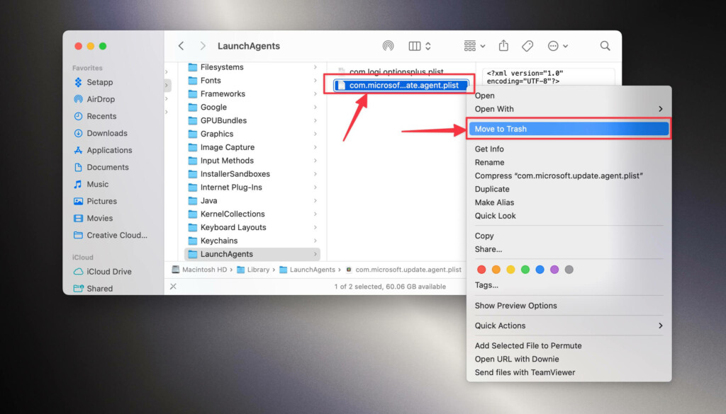 8.Sağ tıklayıncom.microsoft.update.agent.plistDosya ve seçÇöp kutusuna geç.