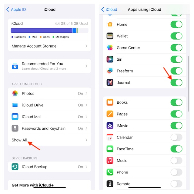 5.Bu ekranda, Apple Journal uygulamasını bulmak için aşağı kaydırın. Ardından, uygulamanın yanındaki anahtarın açık olduğundan emin olun.