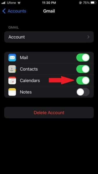 - Sonra geçişi açınTakvimler. Bu, Google takvim olaylarınızın iPhone'unuzun yerleşik takvim uygulamasıyla senkronize edilmesini sağlar. Google takviminin iPhone'unuzun takvimine erişmesine izin vermeniz istenebilir. Muslukİzin vermekizin vermek.