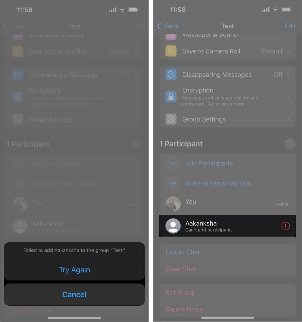 Bunu kontrol etmek için geçici bir WhatsApp grubu oluşturun ve kullanıcıyı gruba ekleyin. Kullanıcıyı ekleyemiyorsanız ve okuyan bir pop-up ile karşılaşırsanızEklenemedi<User> GrubaveyaKatılımcı ekleyemiyorum, bu engellendiğiniz anlamına gelir.