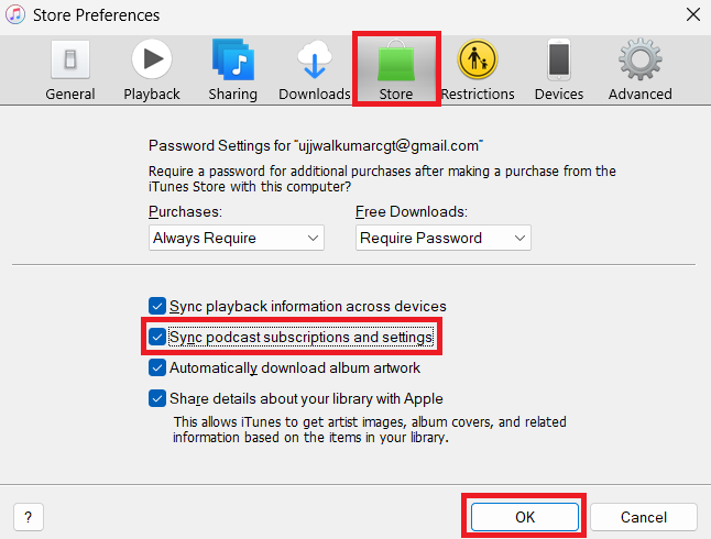 7.Seçme "Podcast aboneliklerini ve ayarlarını senkronize”Ve ardından tıklayarak onaylayınTAMAM.