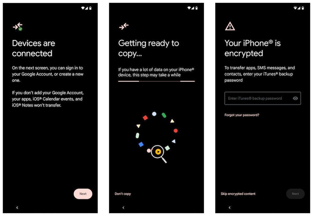 - MuslukSonraki“Telefonlar Bağlı” ekranında. Ardından, Android cihazınız iPhone'unuzdan veri kopyalamaya hazırlanırken bekleyin. İPhone yedeklemelerinizi bir PC veya Mac'te şifrelerseniz, devam etmek için iTunes yedekleme şifrenizi girmeniz gerekir.