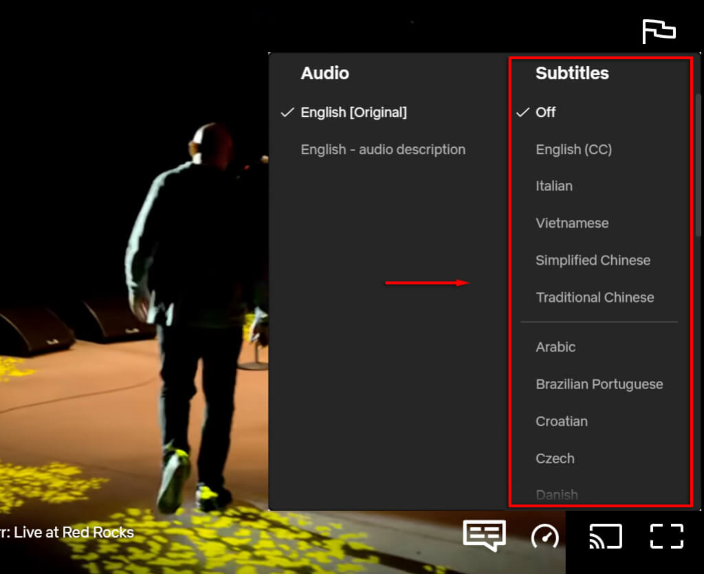 - AltındaAltyazılar, seçmeKapalıKapalı altyazıları kapatmak için. Onları açmak için istediğiniz dili seçin.