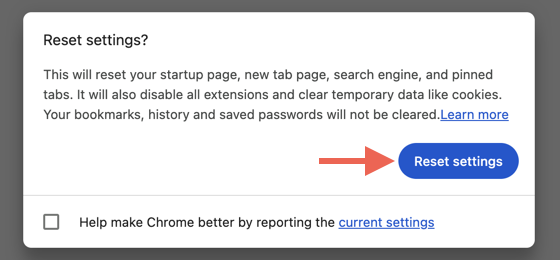 Yukarıdaki düzeltmelerden hiçbiri çalışırsa, Chrome'u sıfırlamanız gerekebilir. Bu işlem, tarayıcı önbelleğini otomatik olarak siler, tüm uzantıları devre dışı bırakır ve ayarları fabrika varsayılanlarına geri döndürür. Kaydedilen yer işaretleriniz ve şifreleriniz bozulmadan kalacaktır.