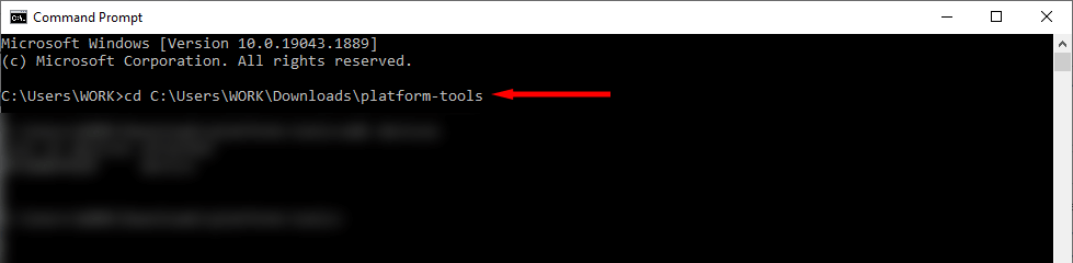 - Ardından, komut istemi dizini, ADB programı ile aynı klasörde olacak şekilde değiştirmelisiniz. Bunu yapmak için “CD” komutunu ve ardından klasörün konumunu kullanmanız gerekir. Örneğin: