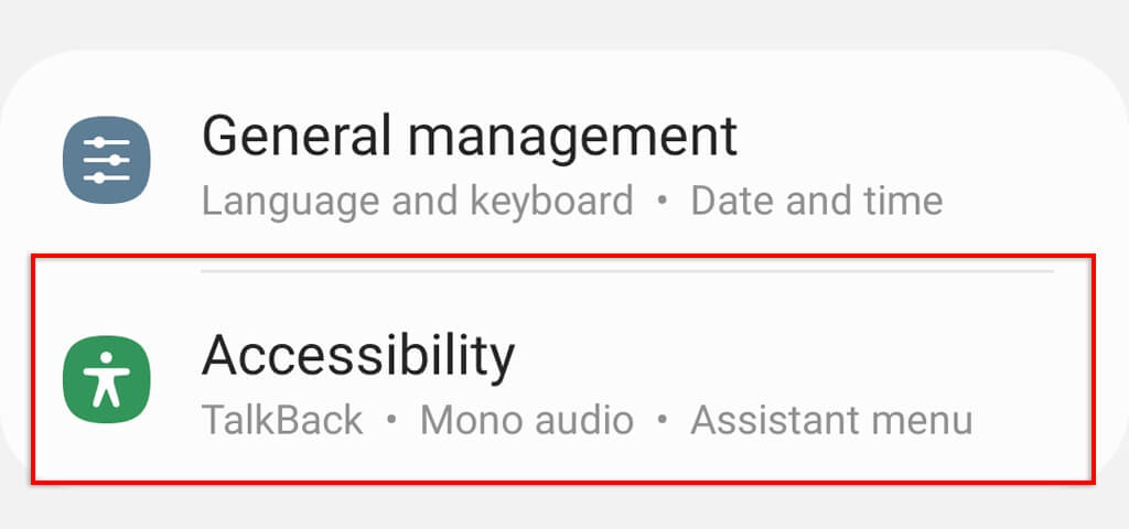 Erişilebilirlik veya Asistan menüsü (Samsung'da), fiziksel bozuklukları olan kullanıcılar için tasarlanmıştır ve yardımcı dokunmatik seçeneklere sahip donanım düğmelerine erişmenin bir yolunu sunar.