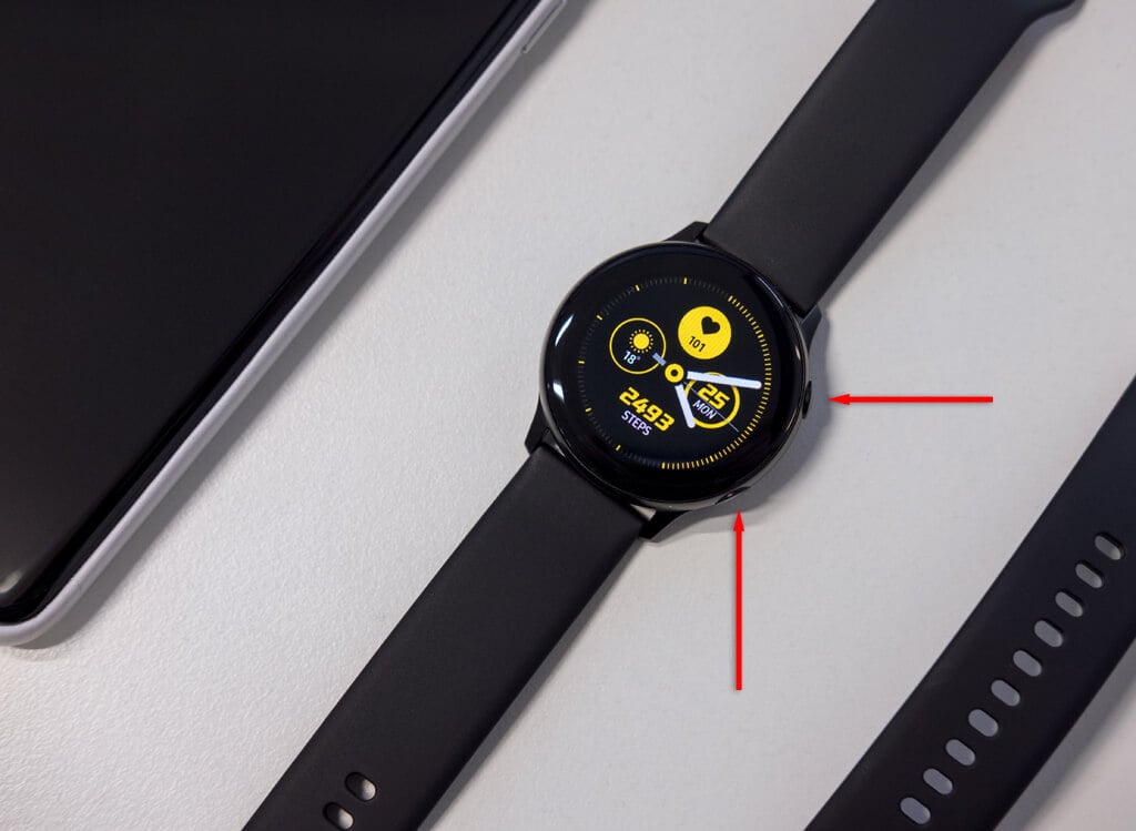 Samsung akıllı saatiniz tepkisiz kalırsa,Ana Düğme DüğmesiVeGeri Düğmesiaynı anda 7 saniye. Arka anahtar, saat yüzünün yan tarafındaki diğer tek düğme.
