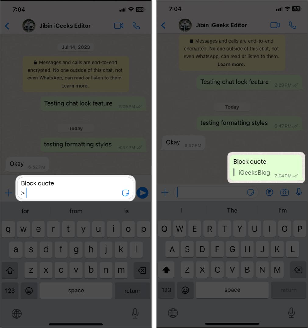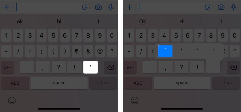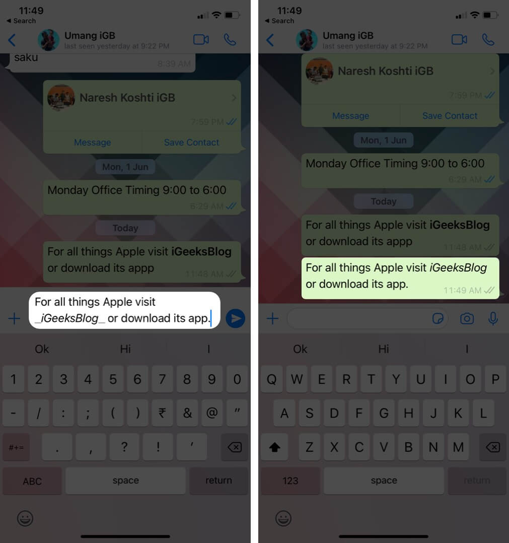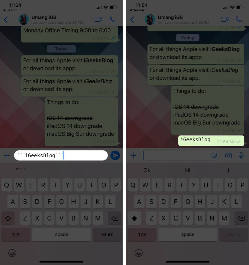 Örneğin, WhatsApp'ta satır içi kodda IgaeksBlog yazmak için `` yazıniGeeksBlog``Not:İPhone'a backticks yazmak için, tek tırnak işaret tuşunu uzun süre basın. (')