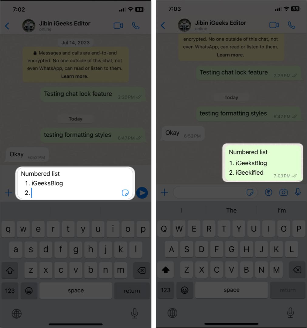 Örneğin, IgaeksBlog'u listelemek ve WhatsApp'ta Igeekified, şöyle yazın- Igex Blog, dönüş tuşuna basın ve Igeekified yazın. Gibi görünecek