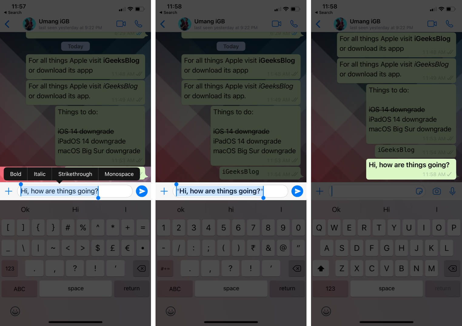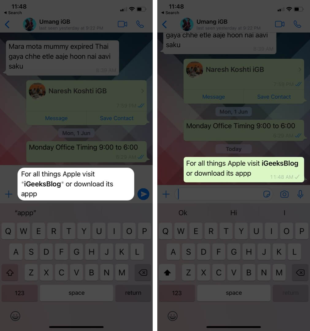 Bir kelime, cümle veya paragrafta zorlamak içinBaşlangıçta ve sonunda bir tilde (yaklaşık işaret ~). Örneğin, WhatsApp'ta IgaeksBlog kelimesini zorlamak için,~ Igex Blog ~Igeeksblog olarak görünecek