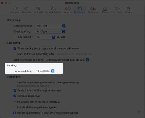 Mac'inizde “Gönder Gönder” i açmak için:Posta Uygulamasına gidin → Menü Çubuğu → Posta → Ayarlar → Oluşturma → Geri Gönder Gönder → 10, 20 veya 30 saniyeyi seçin.
