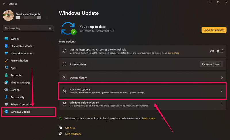 2.GitWindows GüncellemesiSolda gezinme çubuğunda sekme veGelişmiş Seçeneklermenü.