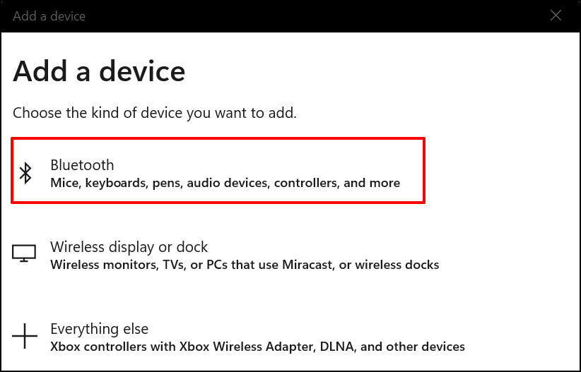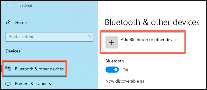 Windows 10'da gitAyarlar>Cihazlar>Bluetooth ve diğer cihazlarve seçBluetooth veya diğer cihazları ekleyin.