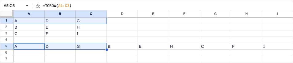 Şimdi işlevin diziyi yukarıdan aşağıya (A, B, C), yukarıdan aşağıya (D, E, F) ve yukarıdan aşağıya (G, H, I) okuduğunu görüyorsunuz.