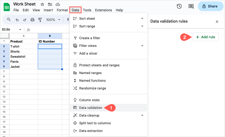 Hücreyi veya menzili seçin, seçinVeri>Veri doğrulamasıve seçKural ekle.