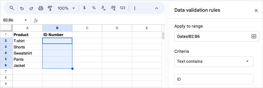 Örneğin, ürün numaralarımız için “ID” içerdiğinden emin olmak için hücremizdeki metni doğrulayacağız.