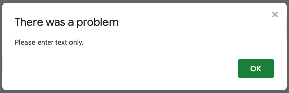 Veri doğrulamasını kullanmanın bir yolu, Google sayfalarında özel bir formüldür. Yukarıdaki önceden ayarlanmış kuralların hiçbiri geçerli olmadığında bu iyi bir seçenektir. Hücrenin metin içerdiğinden veya hücredeki karakter sayısını sınırladığından emin olun.