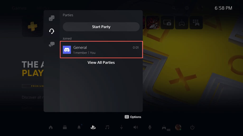 - AKatıldınDiscord Sesli SohbetPS5'te bildirim görünmelidir. SeçinDiscord Sesli Sohbeti GörüntüleDiscord Sesli sohbet kartını açmak için düğme.