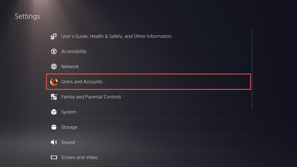 - PS5'in ayarları ekranını ziyaret edin ve seçinKullanıcılar ve Hesaplar.